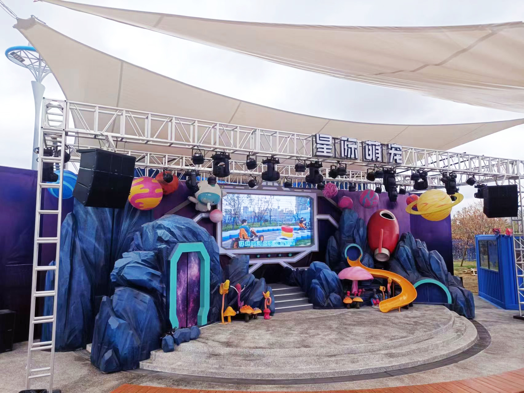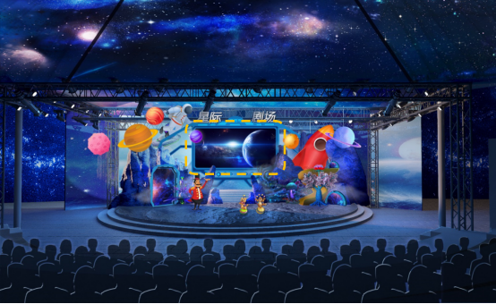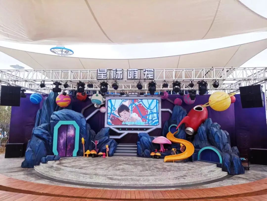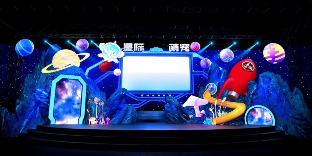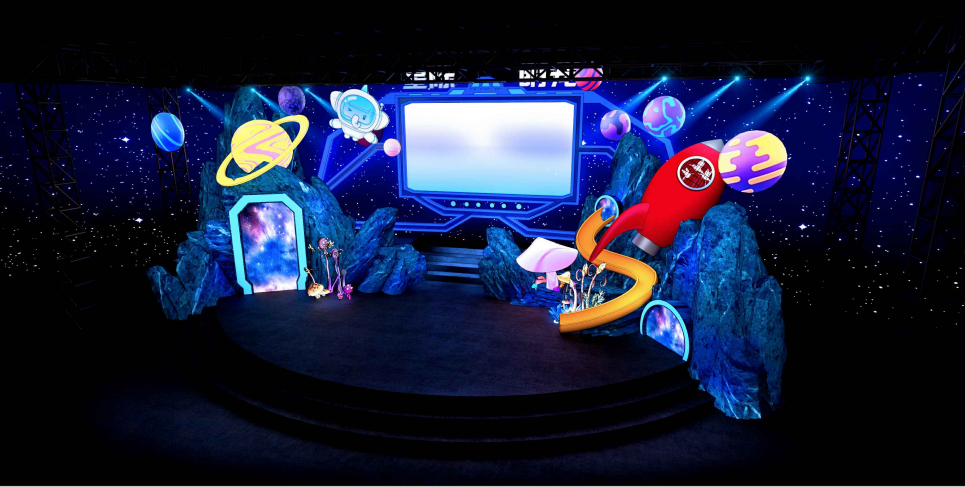 本次舞美方案由周洪宗老師和李永強老師聯(lián)合設(shè)計,以星際萌寵為設(shè)計主題。主題圍繞著“星際探索”親子樂園展開,探索IP互動新場景,趣味探秘浩瀚宇宙,探究生命的神奇,為親子家庭打造全新互動沉浸式游玩體驗。